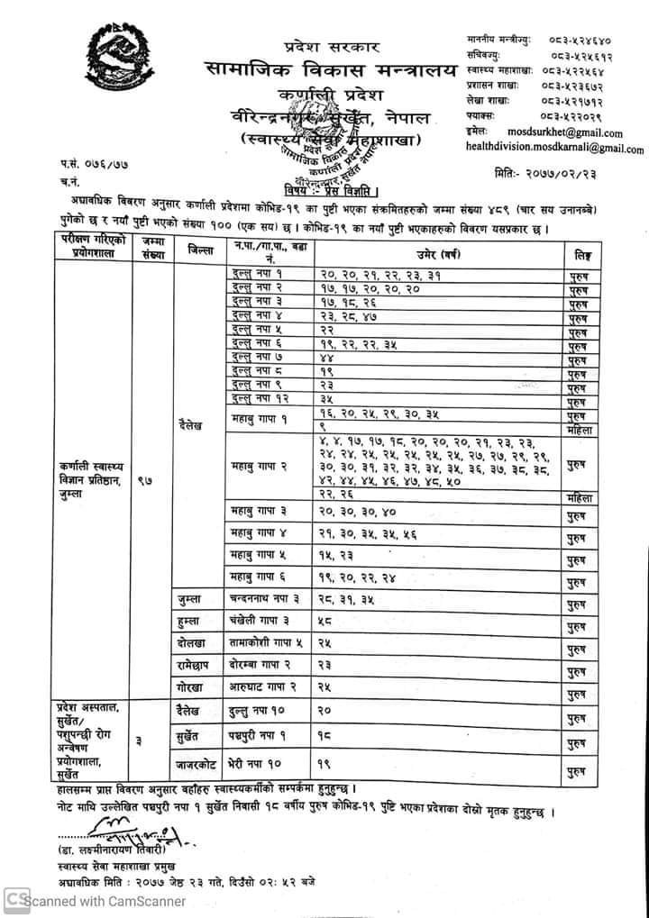 कर्णाली स्वास्थ्य विज्ञान प्रतिष्ठान जुम्ला र प्रदेश अस्पताल सुर्खेतले गरेको परीक्षणमा थप १ सय जनामा संक्रमण पुष्टि भएको मन्त्रालयले जनाएको हो ।