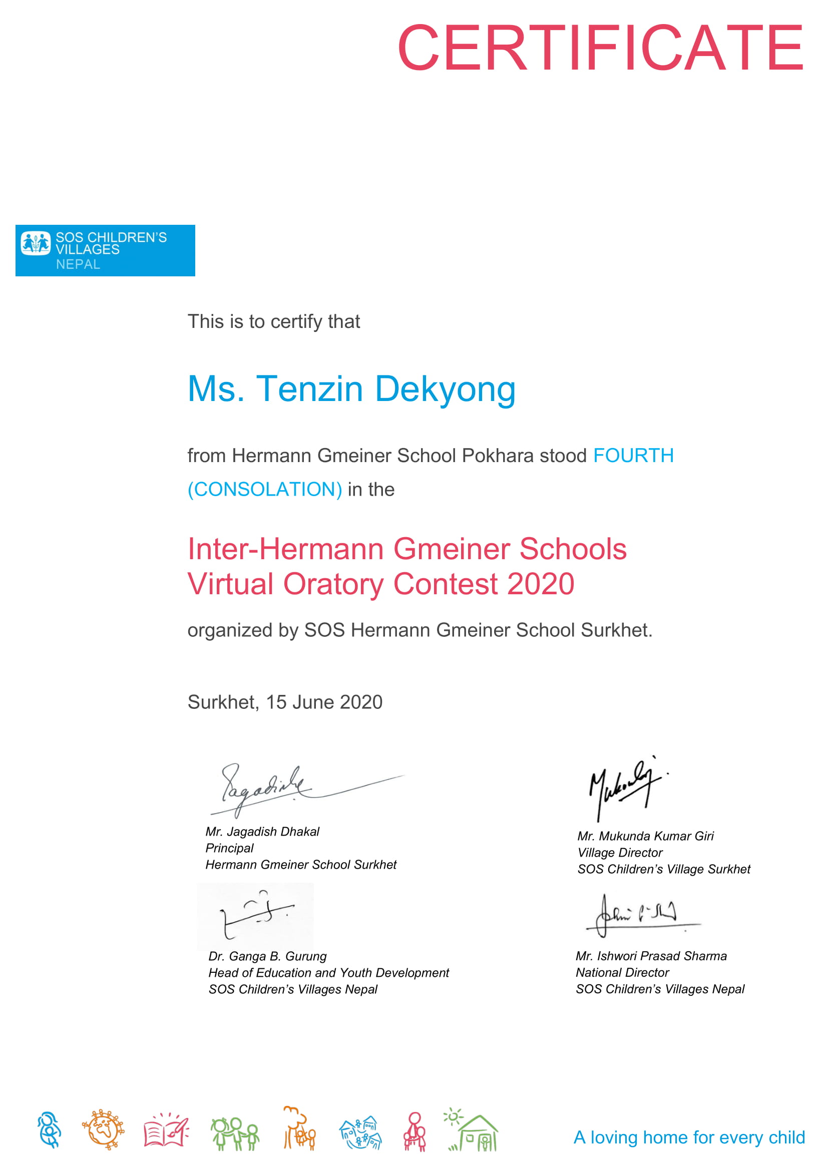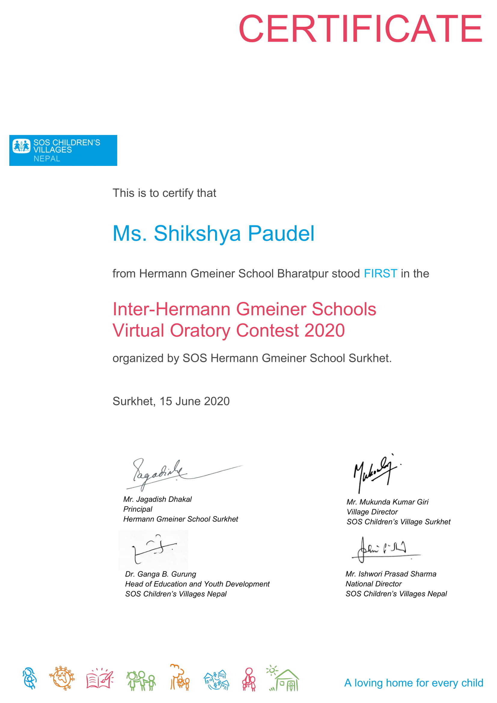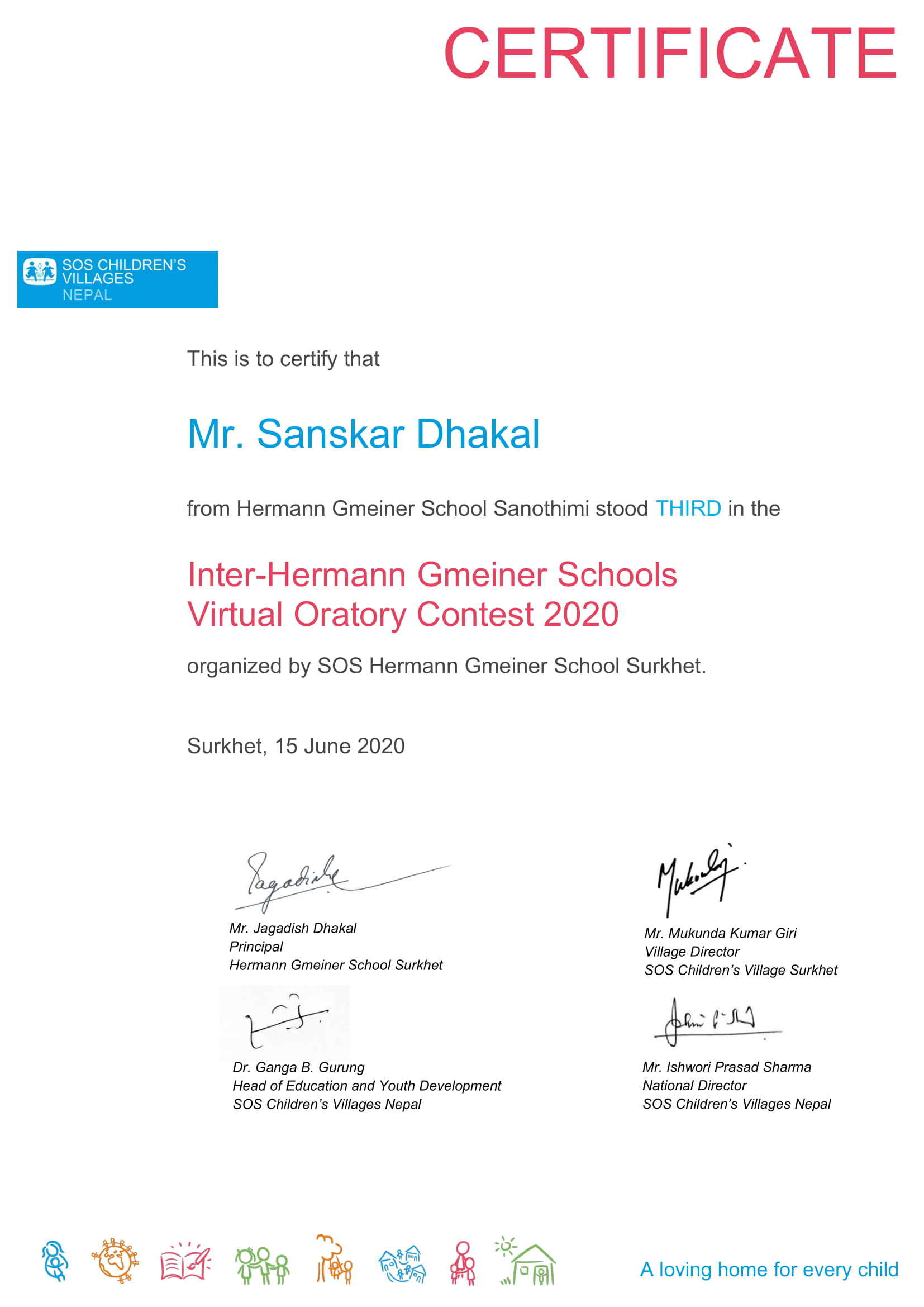 मानव जगतलाई कोभिड -१९ को सन्देश सम्वन्धी विषयमा अंग्रेजी माध्यममा गरिएको उक्त प्रतियोगीतामा सात वटा एसओएस हर्मन माइनर विद्यालयका १४ जना विद्यार्थीले भाग लिएका थिए ।