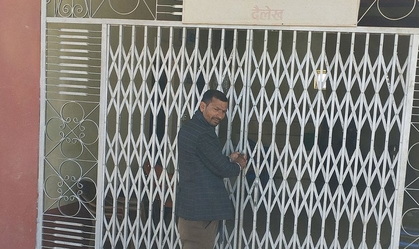 सुर्खेत । दैलेखको चामुण्डाबिन्द्रासैनी नगरपालिका–७ का वडाध्यक्ष इन्द्र चौलागाईंले आफ्नै वडा कार्यालयमा तालाबन्दी गरेका छन् । उनले आइतबार तालाबन्दी गरेको कुरा सामाजिक सञ्जाल फेसबुकमा लेखेका थिए ।