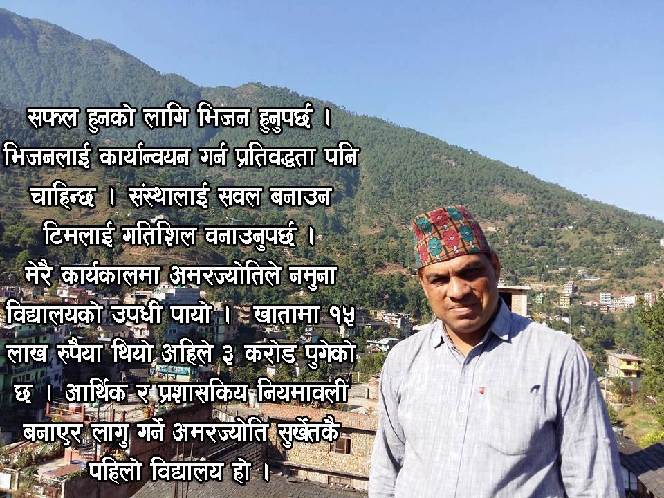 आचार्यले जुन संस्थाको नेतृत्व गर्नुभयो त्यसलाई सफल बनाएरै छाडनुभयो । जस्तो अमर ज्योति नमुना माविको अध्यक्ष हुँदा यो विद्यालयमा हजार÷वाह्रसय विद्यार्थी थिए, अहिले २४÷२५ सय विद्यार्थी छन । उहाँले नेतृत्व गरेपछि विद्यालयको रुप रंग मात्र फेरिएन, शैक्षिक गुणस्तरमा सुधार पनि आयो । विद्यालयका सवै भवनहरु नयाँ बने । विद्यालयमा हरियाली बातावरण, शुद्ध खानेपानीको व्यवस्था भयो । शिक्षण विधीमा सुधार, परम्परागत विधीवाट स्मार्ट पार्टी र मल्टीमिडियामा फड्को, प्लस टुमा विज्ञान, पत्रकारिता, समाजशास्त्र र अहिले ३ वर्षे सिभिल ओभरसियर विषयको पढाई सुरु भयो ।