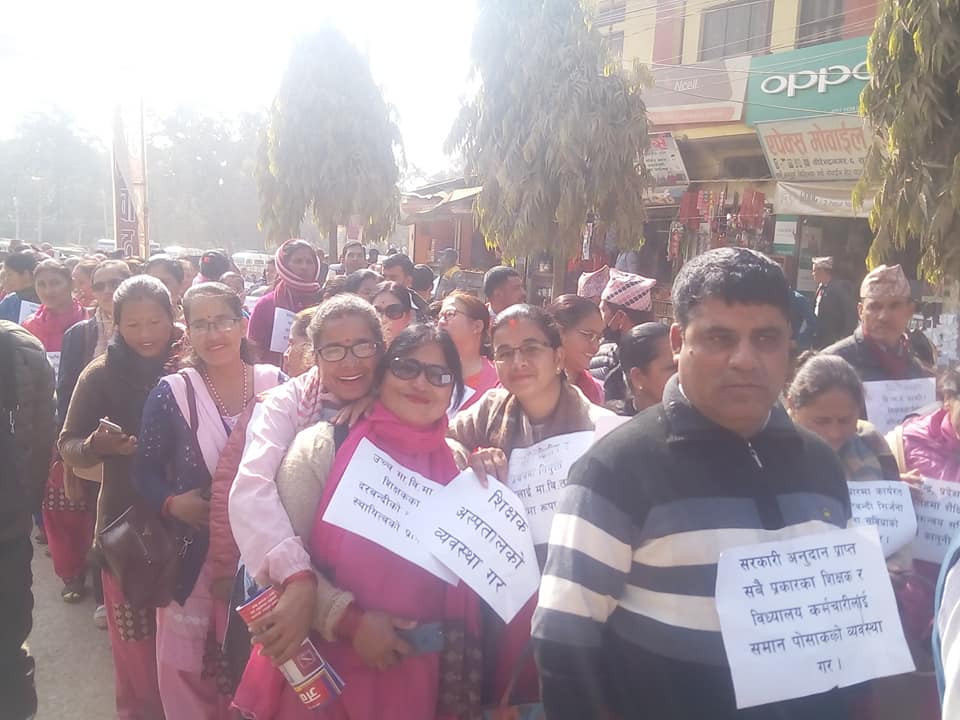 नेपाल शिक्षक महासंघ कर्णाली प्रदेशको अगुवाईमा शिक्षकहरुले मन्त्रालय घेराउ घराउ गरेका हुन । धर्ना दिनु अघि बीरेन्द्रनगरको मंगलगढी चोकबाट र्याली निकालिएको थियो ।धर्नामा रहेका शिक्षकहरुले मागहरू पुरा गर्न सरकार आलटाल गरे अनिश्चितकालिन हड्तालमा उत्रिने चेतावनी दिएका छन ।
